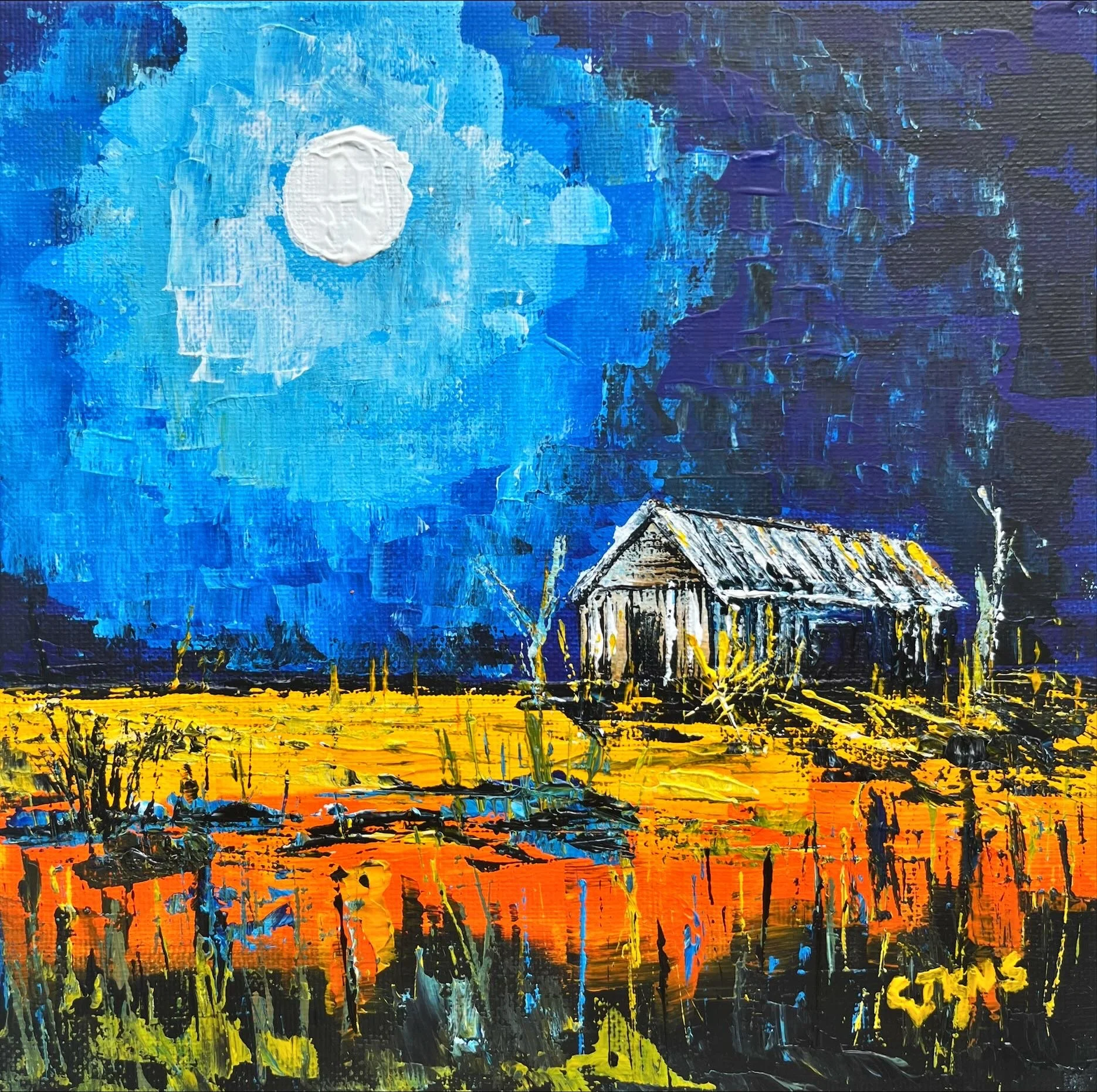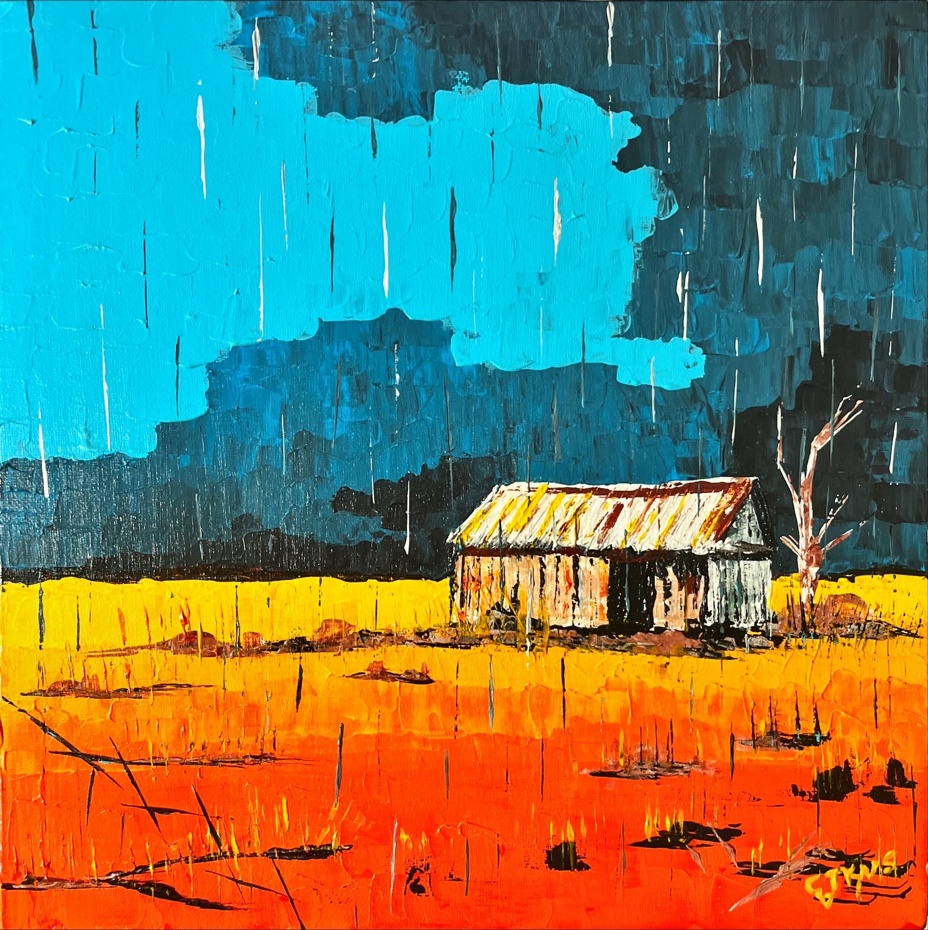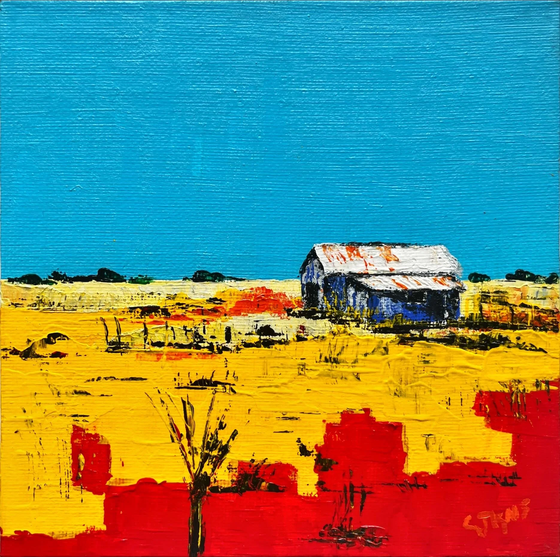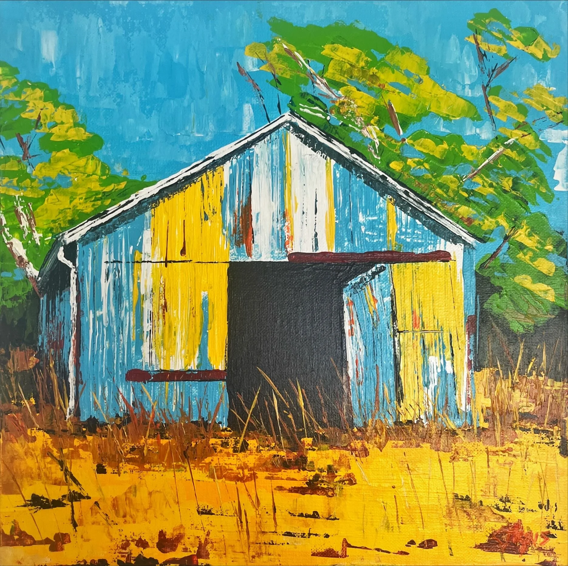 I tried acrylics using a palette knife and started on the Farm Shed series, inspired by the patchwork structures Iād see along the long highway drive from Hamilton to Warrnambool.